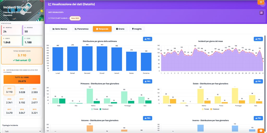 - Filtri avanzati per analizzare i dati per anno, mese, giorno, tipologia, zona, condizioni meteo e fascia oraria