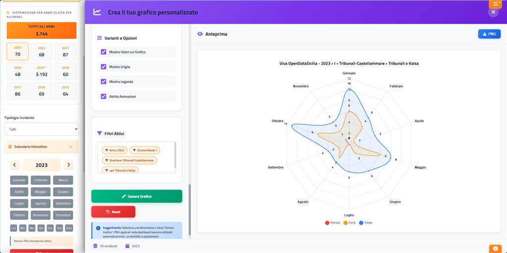 - Export professionale: ogni grafico può essere scaricato come immagine PNG ad alta risoluzione (800×600px) completa di titolo, filtri applicati, fonte dati e crediti