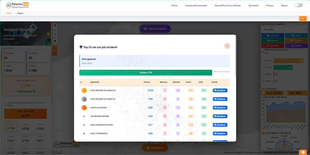 La funzionalità "Top 25 Strade" identifica le vie con il maggior numero di incidenti, mostrando per ciascuna: