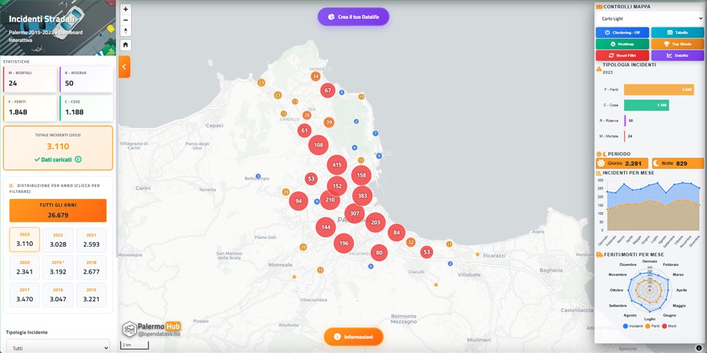 Analizzare i dati degli incidenti stradali non è solo una questione statistica: è un'opportunità per comprendere meglio i rischi della mobilità urbana e orientare politiche di prevenzione efficaci. La Dashboard Interattiva degli Incidenti Stradali di Palermo rappresenta un passo importante in questa direzione, trasformando oltre 28.000 eventi registrati dalla Polizia Municipale del Comune di Palermo tra il 2015 e il 2023 in uno strumento di analisi accessibile, visuale e interattivo.